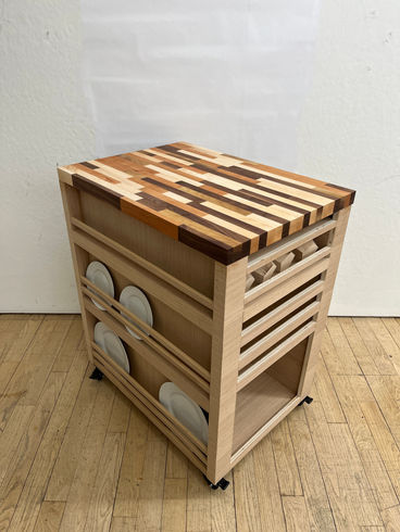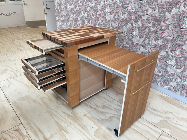 Kiland is a utility kitchen island that can be used for all non-fire activities during cooking and baking. It includes all kitchen item organizers, unfoldable tables, drying racks, and many drawers. I aimed to create a kitchen island with a concise appearance but include all kinds of functions, an excellent assistant to people who are cooking or baking. It is also designed for people live in small space or who cannot afford multiple furniture pieces. This kitchen island works as a dining table and storage cabinet too.